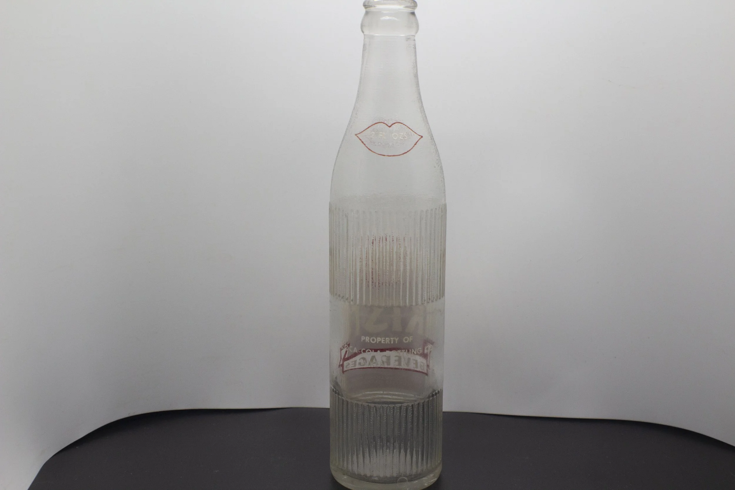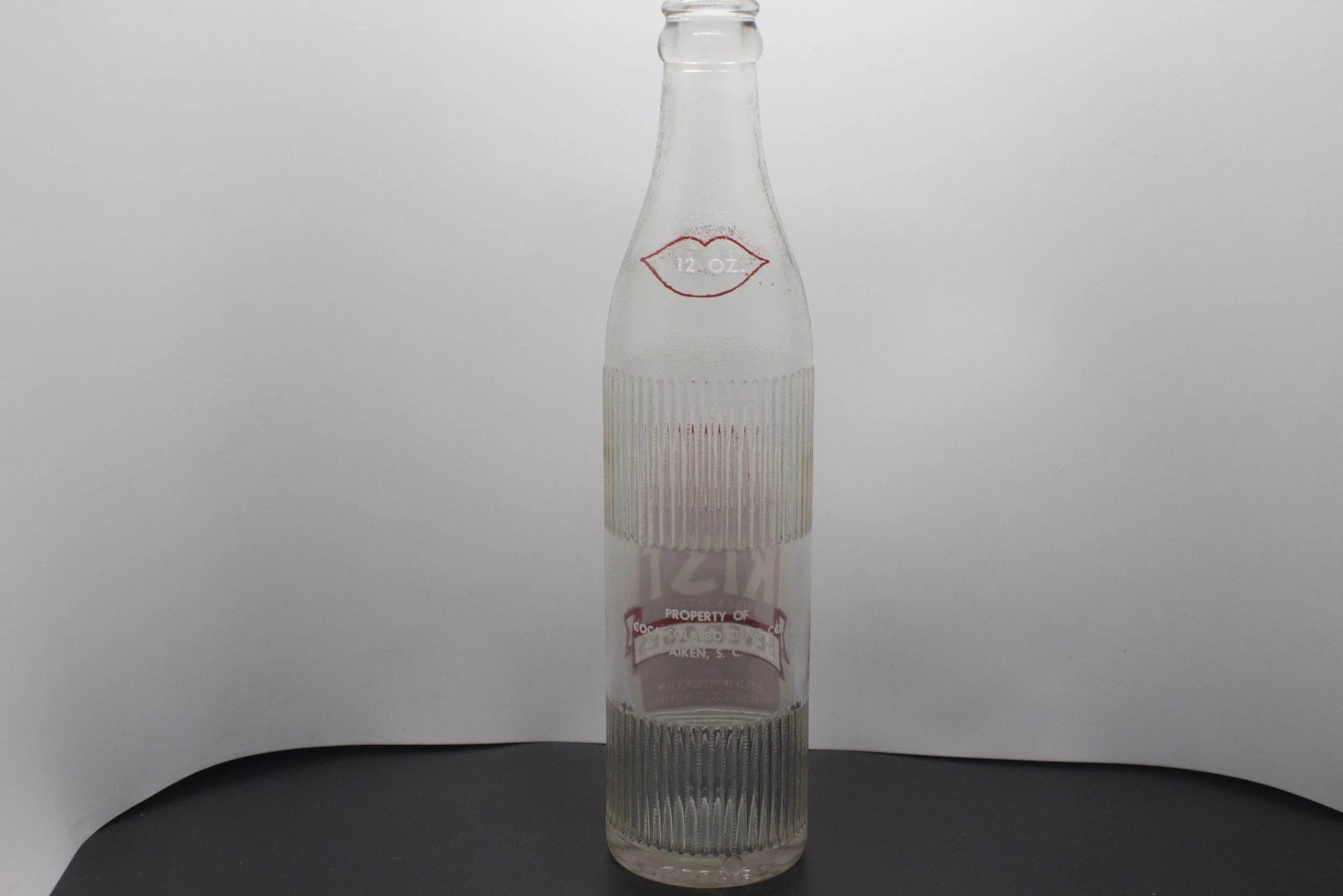 Age - 1962-1963 Type - Machine Front - (shoulder, in white letters in red lips) 12 OZ. (body) Enjoy / CONTENTS 12 FL. OZS. / KIST / REG. U.S. PAT. OFF. / BEVERAGES / BOTTLED UNDER LICENSE FROM / CITRUS PRODUCTS CO., SCHILLER PARK, ILL. Back - (shoulder, in white letters in red lips) 12 OZ. (body) PROPERTY OF / COCA-COLA BOTTLING CO. / AIKEN, S. C. Bottom - 6LGW2 / 2 836 Rarity - Common