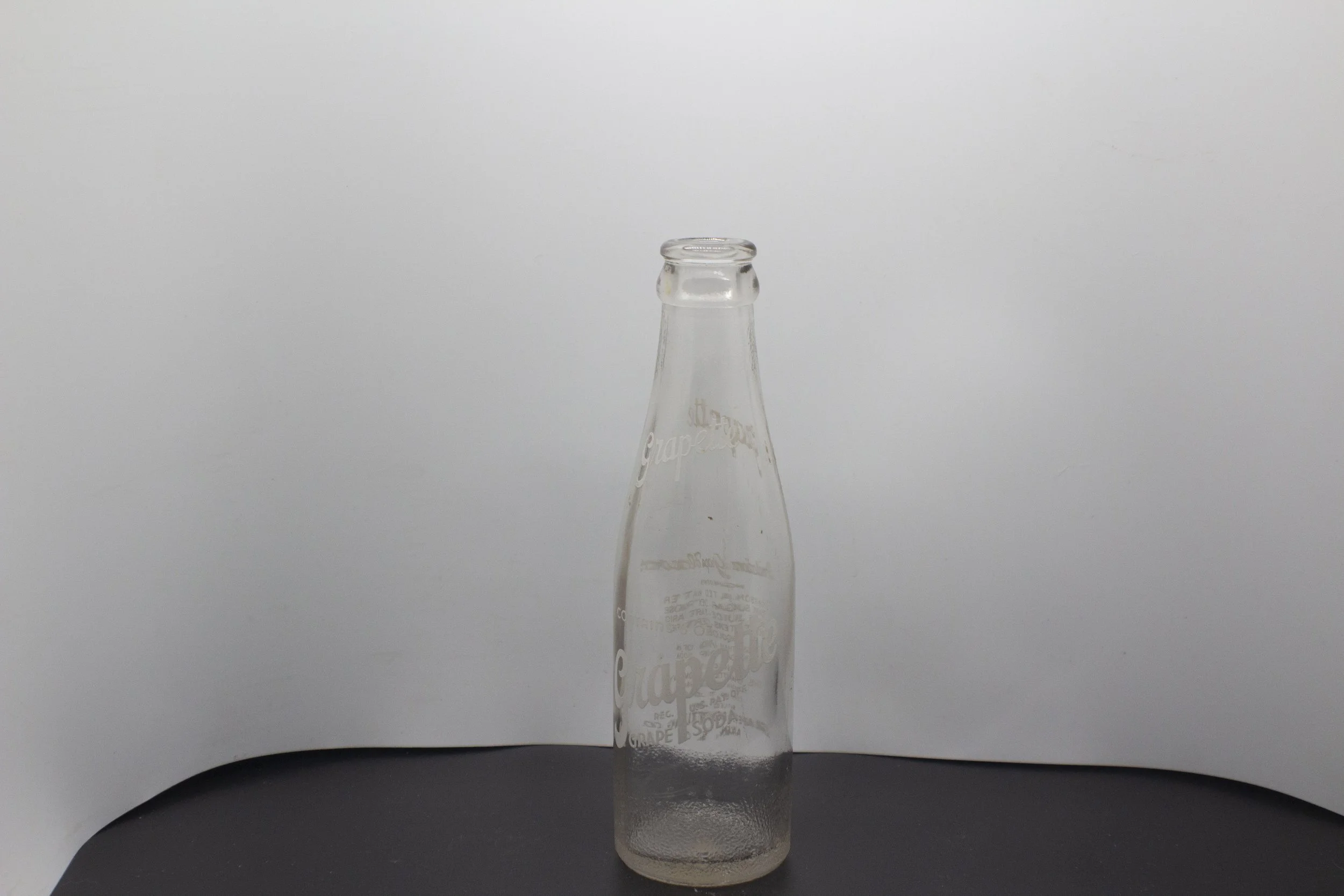 Age -1960 Type - Machine Front - (neck) KING SIZE / Grapette (body) Grapette / ® / GRAPE SODA Base - “Thirsty or Not” Back - (neck) KING SIZE / Grapette Base - CONTENTS 10 FLUID OUNCES / GRAPETTE BOTTLING CO. / AIKEN, S. C. Bottom - 6L G W0 / 2 800 / 10 FL.OZS. DES.PAT. 167345 Rarity - Scarce